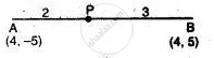 If the line joining the points A(4, - 5) and B(4, 5) is divided by the point P such that `"AP"/"AB" = (2)/(5)`, find the coordinates of P.