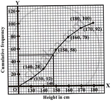 Through mark 50, draw a line parallel to x-axis which meets the curve at A. From A, draw perpendicular to x-axis which meets x-axis at B is the median which is 148 cm.