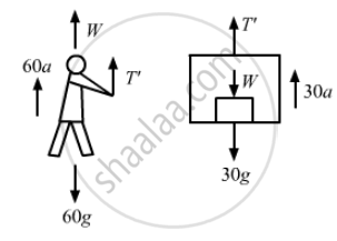 In the following figure shows a man of mass 60 kg standing on a light weighing machine kept in a box of mass 30 kg. The box is hanging from a pulley fixed to the ceiling by a light rope, the other end of which is held by the man himself. If the man manages to keep the box at rest, what is the weight recorded on the machine? What force should he exert on the rope to record his correct weight on the machine?