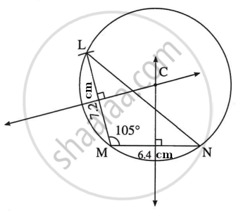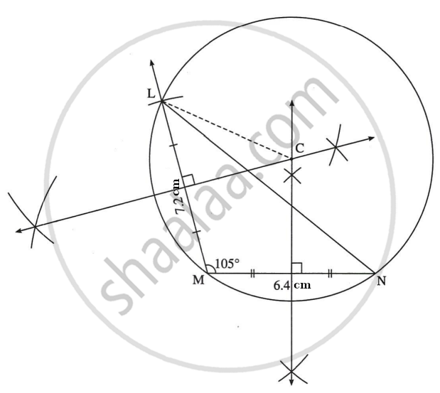 In ΔLMN, LM = 7.2 cm, ∠M = 105°, MN = 6.4 cm, then draw ΔLMN and construct its circumcircle.