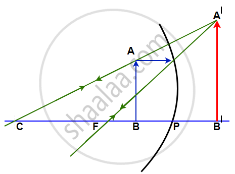 A light ray, parallel to the principal axis, coming from a point on object AB is reflected from the surface of the mirror, it passes through the principal focus and the other ray striking normally to the mirror reflects back and passes through the center of curvature. These two reflected rays, when produced backward, coincide at a point where the image is formed. The image, A'B' is virtual, erect, and magnified in size.