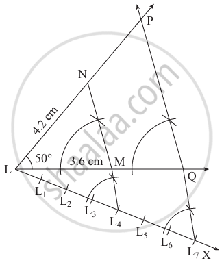 ΔLMN ~ ΔLQP. In ΔLMN, LM = 3.6 cm, ∠L = 50°, LN = 4.2 cm and `("LM")/("LQ") = 4/7`. Construct ΔLQP.