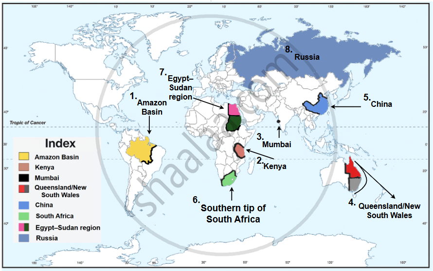 Mark and name the following on the outline map of the world with suitable index: