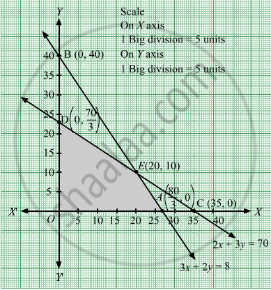 The corner points of the feasible region are O(0, 0), \[A\left( \frac{80}{3}, 0 \right)\] \[E\left( 20, 10 \right)\] and \[D\left( 0, \frac{70}{3} \right)\]