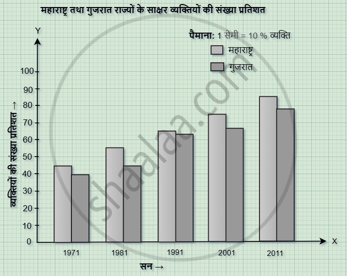 महाराष्ट्र तथा गुजरात राज्यों के साक्षर व्यक्तियों की संख्या प्रतिशत में नीचे तालिका में दी गई हैं। इस जानकारी के आधार पर संयुक्त स्तंभालेख खींचो।