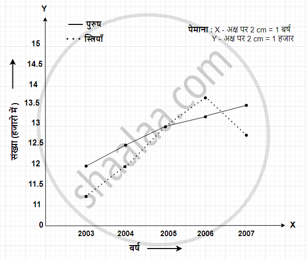 वांछित रैखिक आलेख खींचने के लिए X – अक्ष और Y – अक्ष निर्धारित किए। X – अक्ष पर वर्ष तथा Y – अक्ष पर पुरुषों व स्त्रियों की संख्या अंकित की। अब पुरुषों व स्त्रियों के दिए गए बिन्दु युग्म क्रमशः (2003, 12), (2004, 12.5), (2005, 13), (2006, 13-2), (2007, 13.5) तथा (2003, 113), (2004, 11.9), (2005, 13), (2006, 13.6), (2007, 12.8) अंकित किए। इन बिन्दुओं को रेखाखण्डों द्वारा मिलाकर अभीष्ट रैखिक आलेख प्राप्त किया।