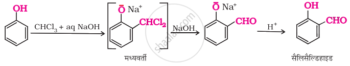 फ़ीनॉल की सोडियम हाइड्रॉक्साइड की उपस्थिति में क्लोरोफॉर्म के साथ अभिक्रिया से बेन्जीन में, –CHO समूह ऑर्थो स्थिति पर प्रवेश कर जाता है। इस अभिक्रिया को राइमर-टीमन अभिक्रिया कहते हैं। प्रतिस्थापित मध्यवर्ती बेन्जिल क्लोराइड क्षार की उपस्थिति में अपघटित होकर सैलिसैल्डिहाइड बनाता है।