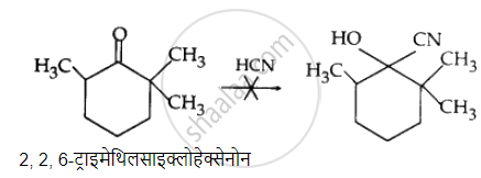 α-स्थानों पर तीन मेथिल समूहों की उपस्थिति के कारण CN– आयनों का नाभिकस्नेही आक्रमण नहीं होता है। साइक्लोहेक्सेन में यह स्टेरिक अवरोध अनुपस्थित होता है। अत: CN– आयनों का नाभिकस्नेही आक्रमण शीघ्रता से होता है। अत: साइक्लोहेक्सेनोन सायनोहाइड्रिन अच्छी मात्रा में प्राप्त होता है।