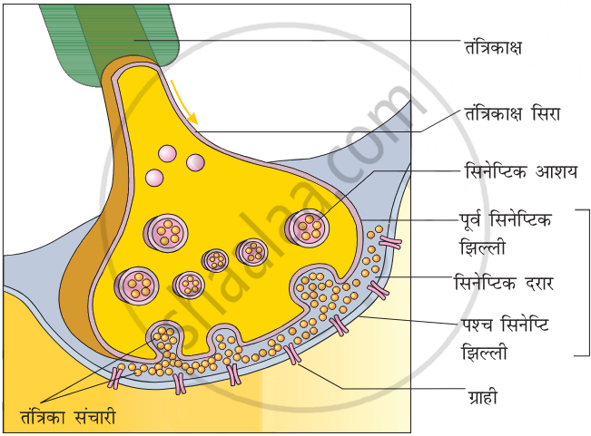 आवेग के प्राप्त होने पर अन्त्य बटन में उपस्थित स्रावी पुटिकाएँ ऐसीटिलकोलीन स्रावित करती हैं। यही पदार्थ दूसरी तन्त्रिका कोशिका के डेण्ड्राईट में कार्यात्मक विभव को स्थापित कर देता है।
