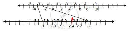 यहाँ, –2.4, –3 और –2 के बीच स्थित होगा, इसलिए –3 और –2 के बीच की संख्या रेखा को फिर से खींचने पर हम –2.4 को आसानी से पा सकते हैं।