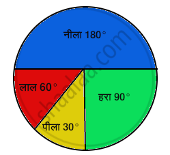 प्रत्येक त्रिज्यखंड का आनुपातिक भाग ज्ञात कीजिए। उदाहरणार्थ : नीला `18/36 = 1/2` है ; हरा `9/36 = 1/4` ; इत्यादि। इसे प्रयोग करते हुए, संगत कोण ज्ञात कीजिए।