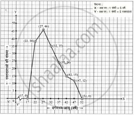 निम्नलिखित वर्गीकृत बारंबारता सारिणी के लिए बारंबारता बहुभुज खींचिए। रक्तदाताओं की आयु (वर्षे) 20 - 24 25 - 29 30 - 34 35 - 39 40 - 44 45 - 49 रक्तदाताओं की संख्या 38 46 35 24 15 12 - Mathematics 1 - Algebra [गणित १ - बीजगणित]