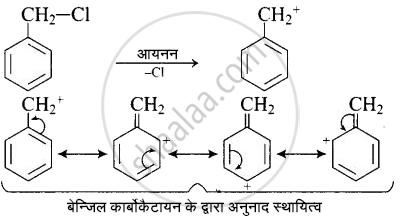 C6H5CH2Cl आसानी से \[\ce{C6H5CH^+_2}\] कार्बोकैटायन देने के लिए आयनीकरण से गुजरता है, जो अनुनाद द्वारा स्थिर होता है।