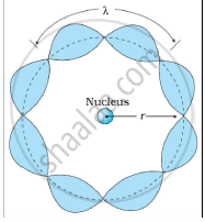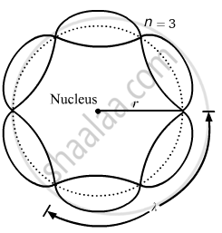 Bohr's second postulate states that the angular momentum of an electron has only those values that are integral multiples of `"h"/(2pi)` He thought that the motion of electrons within an atom is associated with the standing wave along the orbit as shown.