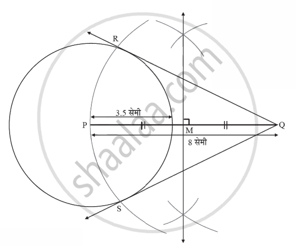P केंद्र व 3.5 सेमी त्रिज्या घेऊन एक वर्तुळ काढा. वर्तुळकेंद्रापासून 8 सेमी अंतरावर Q बिंदू घ्या. Q बिंदूतून वर्तुळाला स्पर्शिका काढा.