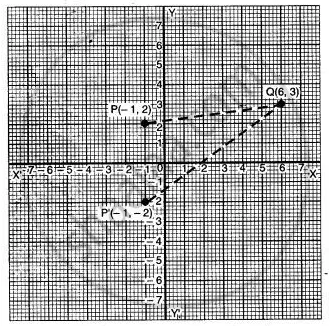 P, Q have co-ordinates (-1, 2) and (6, 3) respectively. Reflect P on the X-axis to P’. Find: