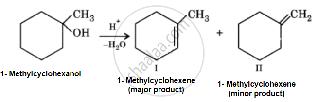 Acid catalyzed dehydration of 1-methylcyclohexanol can give two products, I and II. Since product (I) is more highly substituted, it is the major product according to the Setzeff rule.