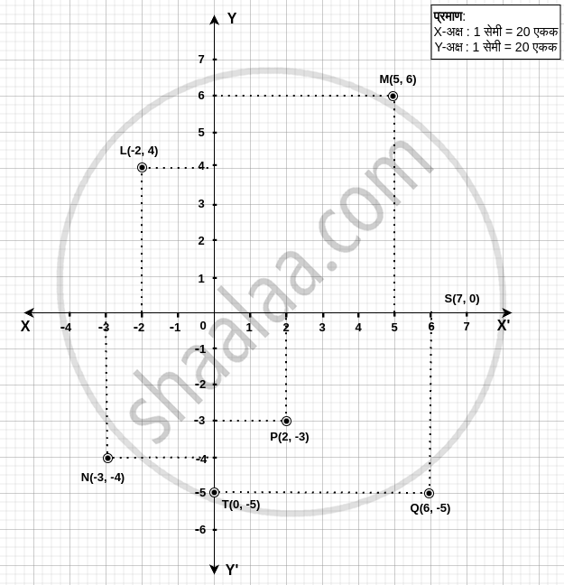 दिलेले बिंदू L(-2, 4), M(5, 6), N(-3, -4), P(2, -3), Q(6, -5), S(7, 0) आणि T(0, -5) आहेत. हे बिंदू निर्देशांक पद्धतीवर खालीलप्रमाणे स्थापन केले जाऊ शकतात: