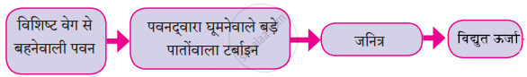 पवन ऊर्जा से विद्युत ऊर्जा की निर्मिती की प्रवाह तालिका पूर्ण कीजिए।