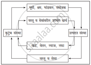 - वरील आकृतीतून हे स्पष्ट होते की, कुटुंब संस्थेने भूमी, मेहनत, भांडवल आणि व्यवस्थापन ही साधने उत्पादन संस्थेकडे दिल्यामुळे, त्यांना मोबदला म्हणून अनुक्रमे भाडे, पगार, व्याज आणि नफा प्राप्त होतो. याउलट, उत्पादन संस्थेने कुटुंबांना वस्तू व सेवा दिल्याने, ग्राहकांनी त्या खरेदी करण्यासाठी जो पैसा खर्च केला तो मोबदला म्हणून उत्पादन संस्थेला मिळतो. अशा प्रकारे, उत्पादन संस्थेकडून कुटुंबांकडे साधनांच्या मोबदल्याचा आणि कुटुंबांकडून उत्पादन संस्थेकडे वस्तू व सेवांवरील खर्चाचा पैशाच्या रूपातील प्रवाह सतत सुरू असतो. हा प्रवाह आकृतीत आतील बाजूने दाखवला आहे.