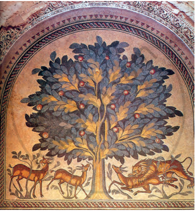 इस फर्श को चित्रों, प्रतिमाओं एवं पच्चीकारी की सुंदर कला से सुसज्जित किया गया था। इनका निर्माण नि:संदेह रोमन व ससानी वास्तुशिल्प के प्रभावस्वरूप हुआ था।