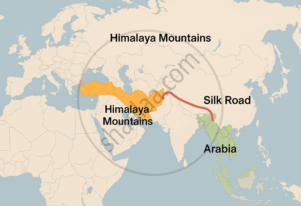 Show the following on a world map: 1. The Himalaya Mountain 2. The Silk Road 3. Arabia - Geography