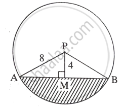 संलग्न आकृति में वृत्त का केंद्र P और रेख AB वृत्त की जीवा है। PA = 8 सेमी और जीवा AB वृत्त के केंद्र से 4 सेमी की दूरी पर हो तो रेखांकित भाग का क्षेत्रफल ज्ञात कीजिए। (π=3.14,3=1.73) - Mathematics 2 - Geometry [गणित २ - ज्यामिति]