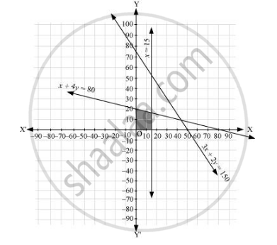 The graph of the lines, 3x + 2y = 150, x + 4y = 80, and x = 15, are drawn in the figure below.