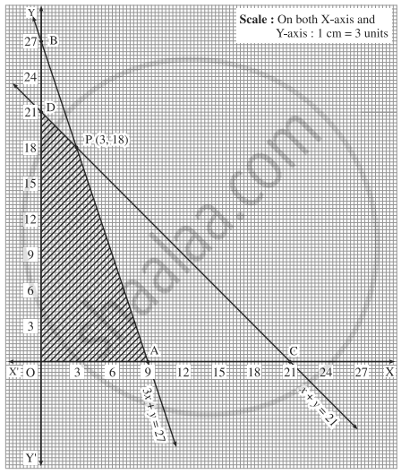 The feasible region is OAPDO which is shaded region in the graph. The vertices of the feasible region are O(0, 0), A (9, 0), P and D (0, 21). P is the point of intersection of lines