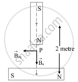 Let P be the midpoint of the line joining the centres of two bar magnets. As shown in figure, P is at the axis of one bar magnet and at the equator of another bar magnet. Thus, the magnetic field on the axis of the first bar magnet at distance of 1 m from the centre will be,