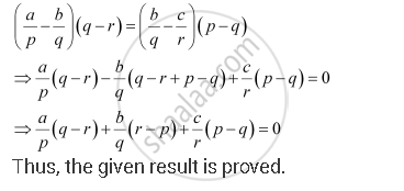 Prove that `a/p (q - r) + b/q (r- p) + c/r (p - q) = 0`