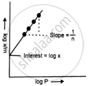 Thus, if we plot a graph between `log (x/m)` and log P, a straight line will be obtained. The slope of the line is equal to `1/n` and the intercept is equal to log k. Thus the values of k and n are determined. n can take a value any where between 1 and a large number depending upon the pressure. At low pressure n = 1.