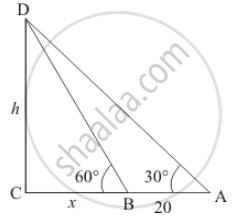 Let h be the height of the tower and the angle of elevation of the top of the tower from a point A on the ground is  30° and on moving with distance 20 m  towards the foot of tower on the point B is 60°.