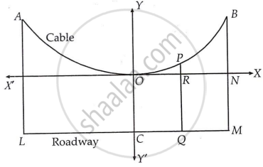 Let AOB be the cable of uniformly loaded suspension bridge. Let AL and BM be the longest wires of length 30 m each. Let OC be the shortest wire of length 6 m and LM be the roadway.