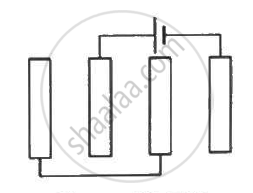 Each of the plates shown in figure has surface area `(96/∈_0) xx 10^-12` Fm on one side and the separation between the consecutive plates is 4⋅0 mm. The emf of the battery connected is 10 volts. Find the magnitude of the charge supplied by the battery to each of the plates connected to it.