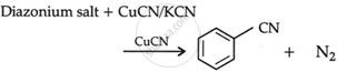 \[\ce{Ar - N+2X- ->[Cu CN/KCN] Ar - CN + N2}\]