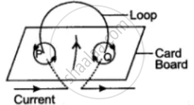 The diagram shows a current-carrying coil passing through a cardboard sheet. Draw three magnetic lines of force on the board.