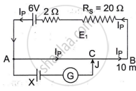 The Figure below shows a potentiometer circuit in which the driver cell D has an emf of 6 V and internal resistance of 2 Ω. The potentiometer wire AB is 10 m long and has a resistance of 28 Ω. The series resistance RS is of 2 Ω.