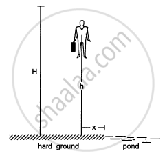 A man of mass M having a bag of mass m slips from the roof of a tall building of height H and starts falling vertically in the following figure. When at a height h from the ground, the notices that the ground below him is pretty hard, but there is a pond at a horizontal distance x from the line of fall. In order to save himself he throws the bag horizontally (with respect to himself) in the direction opposite to the pond. Calculate the minimum horizontal velocity imparted to the bag so that the man lands in the water. If the man just succeeds to avoid the hard ground, where will the bag land?