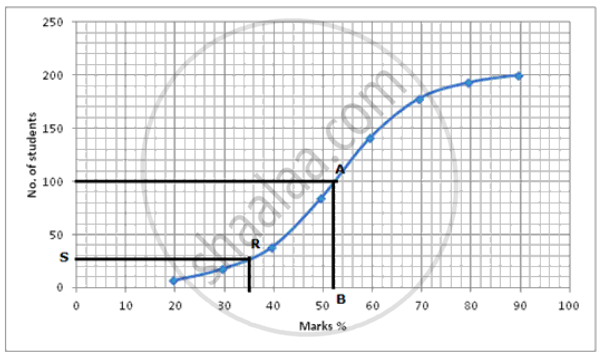 (ii)  From marks % = 35 draw a line parallel to y-axis and meet the curve at R. From R, Draw a perpendicular on y-axis which meets it at S. The difference of the value obtained when subtracted from 200 gives the number of students who scored more than 35%.