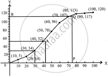 ii. On x-axis, a point P representing 75, drawn vertical line meeting ogive at Q. From Q draw a ⊥ on y-axis meeting y-axis at R, the ordinate of y be 110.