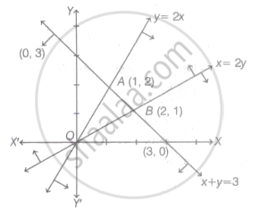 Intersecting point of line y = 2x and x + y = 3 is A(1, 2) and intersecting point of line x = 2y and x + y = 3 is B (2, 1).