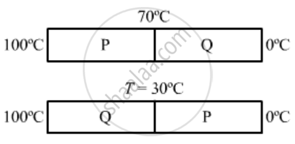 The two rods shown in following figure have identical geometrical dimensions. They are in contact with two heat baths at temperatures 100°C and 0°C. The temperature of the junction is 70°C. Find the temperature of the junction if the rods are interchanged.