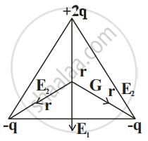 Three Charges 2q, -q and -q lie at vertices of a triangle. The value of E and V at centroid of triangle will be ______.