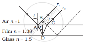 Consider a ray incident at an angle i. A part of this ray is reflected from the air-film interface and a part is refracted inside. This is partly reflected at the film-glass interface and a part transmitted. A part of the reflected ray is reflected at the film-air interface and a part is transmitted as r2 parallel to r1. Of course, successive reflections and transmissions will keep on decreasing the amplitude of the wave. Hence rays r1 and r2 shall dominate the behaviour. If the incident light is to be transmitted through the lens, r1 and r2 should interfere destructively. Both the reflections at A and D are from lower to higher refractive index and hence there is no phase change on reflection. The optical path difference between r2 and r1 is n (AD + CD) – AB.