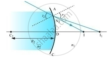 Trace the rays of light showing the formation of an image due to a point object placed on the axis of a spherical surface separating the two media of refractive indices n1 and n2. Establish the relation between the distances of the object, the image and the radius of curvature from the central point of the spherical surface.