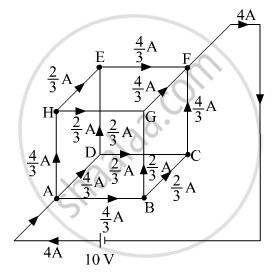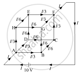 A battery of 10 V is connected across the diagonally opposite points a and f of the given network. Each side of the cube represents a 3-ohm resistor. Current entrees through the point a and leaves through the point f. Let I current is drawn from the battery and enters through point a, due to the symmetry of cube between point a and f, the current will divide itself into equal parts at each corner of the cube.