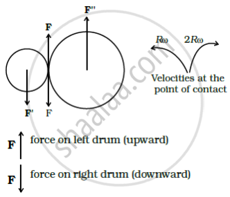 Two cylindrical hollow drums of radii R and 2R, and of a common height h, are rotating with angular velocities ω(anti-clockwise) and ω(clockwise), respectively. Their axes, fixed are parallel and in a horizontal plane separated by (3R + δ). They are now brought in contact (δ → 0).