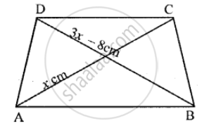 Two diagonals of an isosceles trapezium are x cm and (3x – 8) cm. Find the value of x.