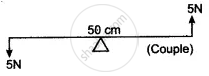 Two forces each of 5N act vertically upwards and downwards respectively on the two ends of a uniform metre rule which is placed at its mid-point as shown in the diagram. Determine the magnitude of the resultant moment of these forces about the midpoint.